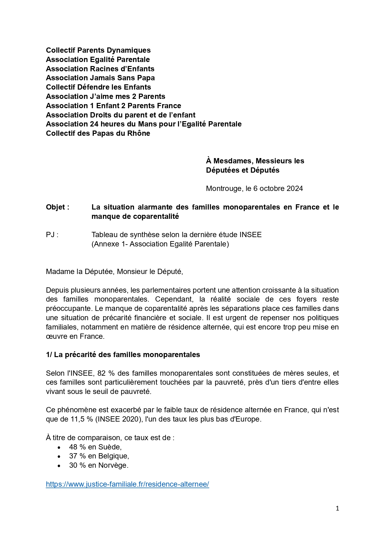 Le collectif Défendre les Enfants, aux côtés de plusieurs autres associations, vient de cosigner un courrier adressé aux députés français, alertant sur la situation alarmante des familles monoparentales et le manque de coparentalité en France. Dans ce message, ces organisations soulignent l’urgence de repenser les politiques familiales, particulièrement en matière de résidence alternée. Ce mode de garde, bien qu’il ait fait ses preuves dans plusieurs pays européens, reste sous-utilisé en France, au détriment des enfants et des parents concernés.