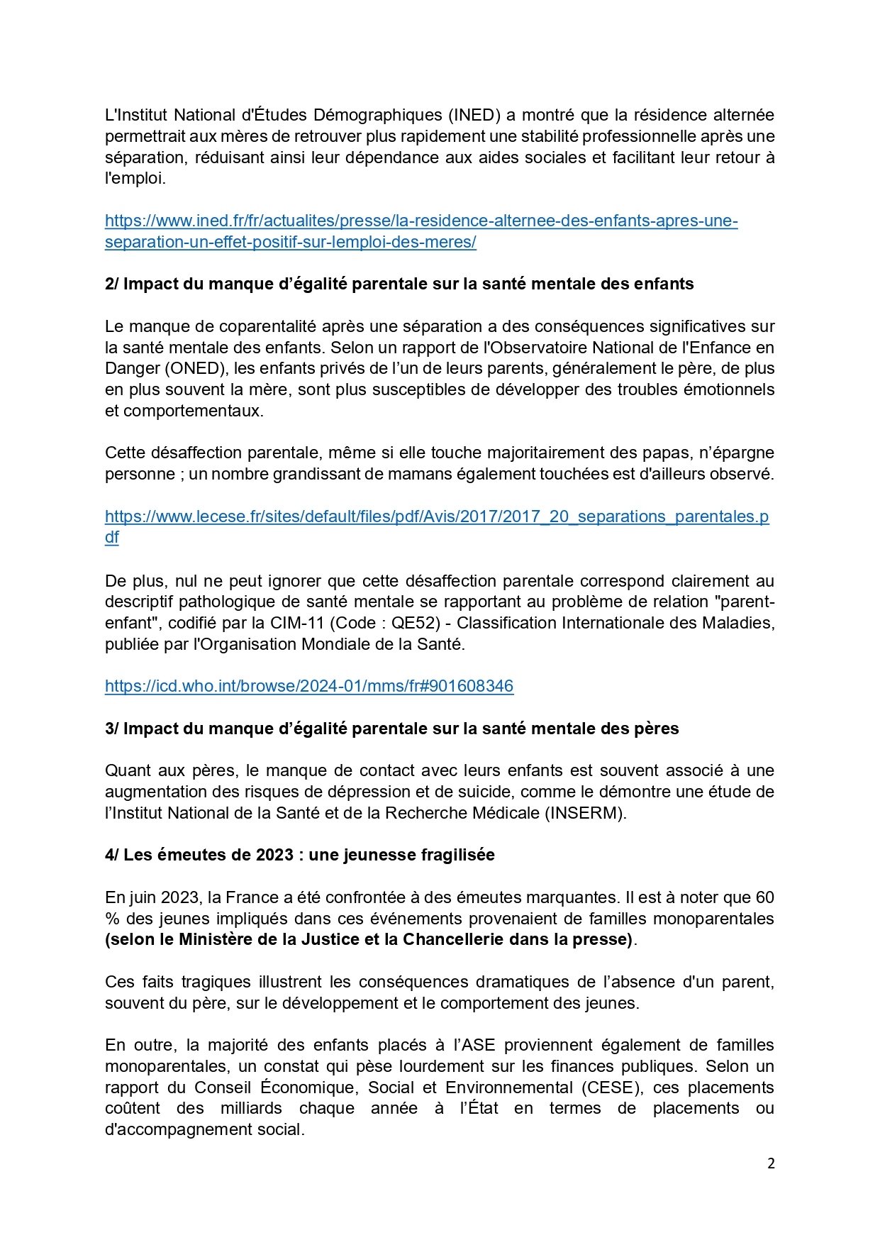 Au-delà des enjeux économiques, la coparentalité a un impact significatif sur la santé mentale des enfants. Le manque de contact avec l’un des parents, souvent le père mais de plus en plus la mère, peut entraîner des troubles émotionnels et comportementaux. Ce phénomène est tellement courant qu’il est désormais reconnu par la Classification Internationale des Maladies (CIM-11) sous le code QE52, relatif aux troubles des relations parent-enfant.
