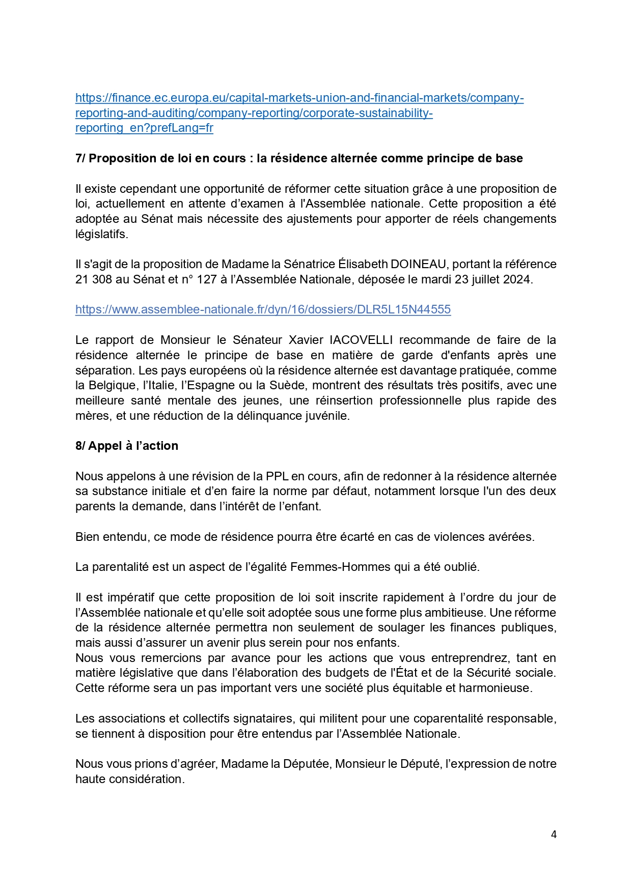 Les associations signataires appellent les parlementaires à inscrire cette proposition à l’ordre du jour et à en faire une priorité nationale. Faire de la résidence alternée un principe de base, sauf en cas de violences avérées, représenterait un pas décisif vers une société plus équitable pour les enfants et les parents.