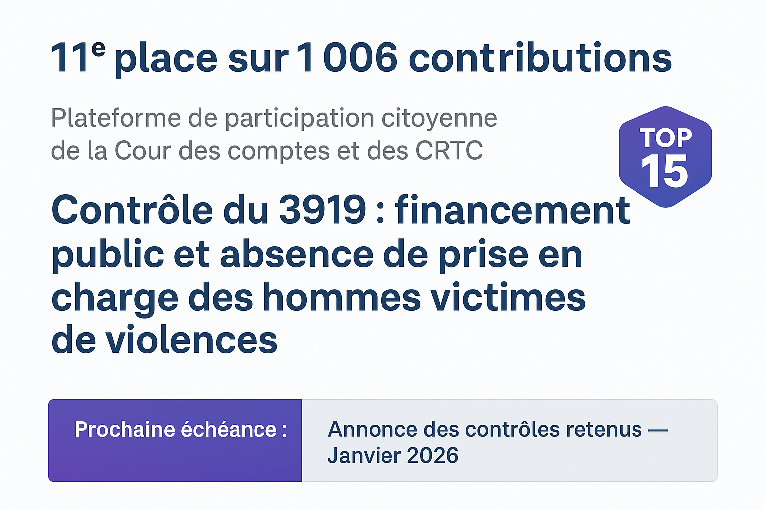 Le 2 septembre 2025 à 14 h 31, Fabien Wald a déposé une contribution sur la plateforme citoyenne de la Cour des comptes intitulée « Contrôle du 3919 : financement public et absence de prise en charge des hommes victimes de violences ». En moins de 24 heures, cette initiative est parvenue à se hisser à la première place en nombre de soutiens, rassemblant de nombreux soutiens. Cet engouement témoigne de l’adhésion citoyenne à une problématique jusque-là peu mise en lumière : l’accès inégalitaire à un service public essentiel.