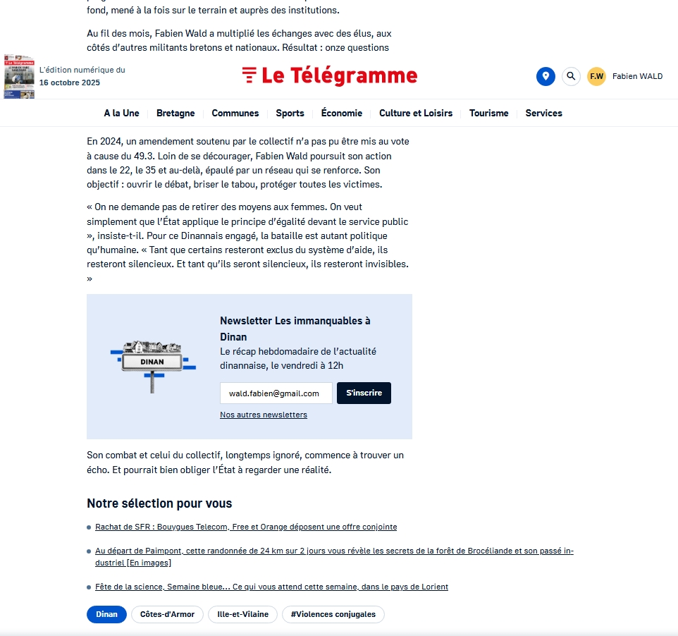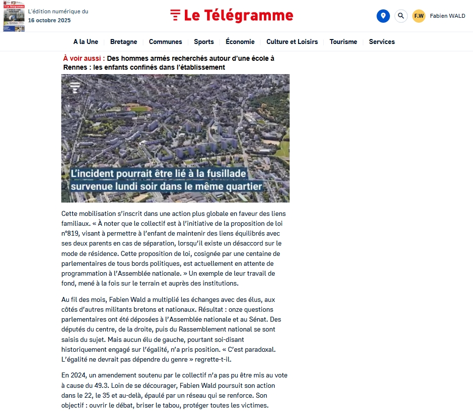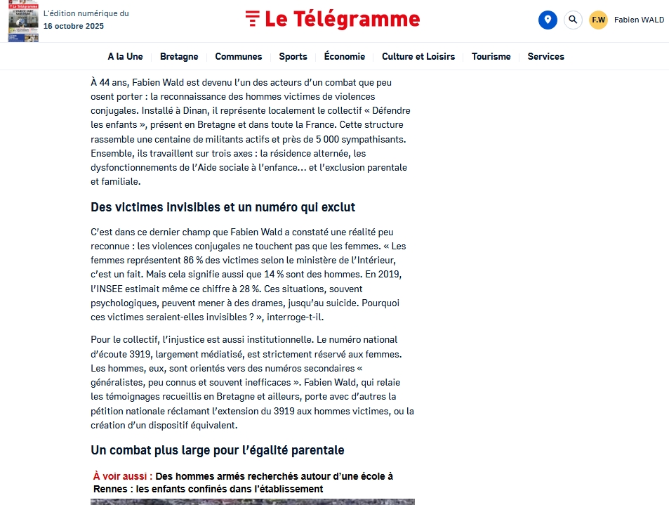 Le journal Le Télégramme consacre un article à Fabien Wald, membre du collectif Défendre les enfants, engagé à Dinan pour la protection de l’enfance. Intitulé « Fabien Wald, le Dinannais qui se bat pour que les enfants ne soient plus invisibles », cet article met en lumière son parcours et son investissement associatif en faveur d’une meilleure reconnaissance des situations de maltraitance et d’une prise en charge renforcée des victimes.
