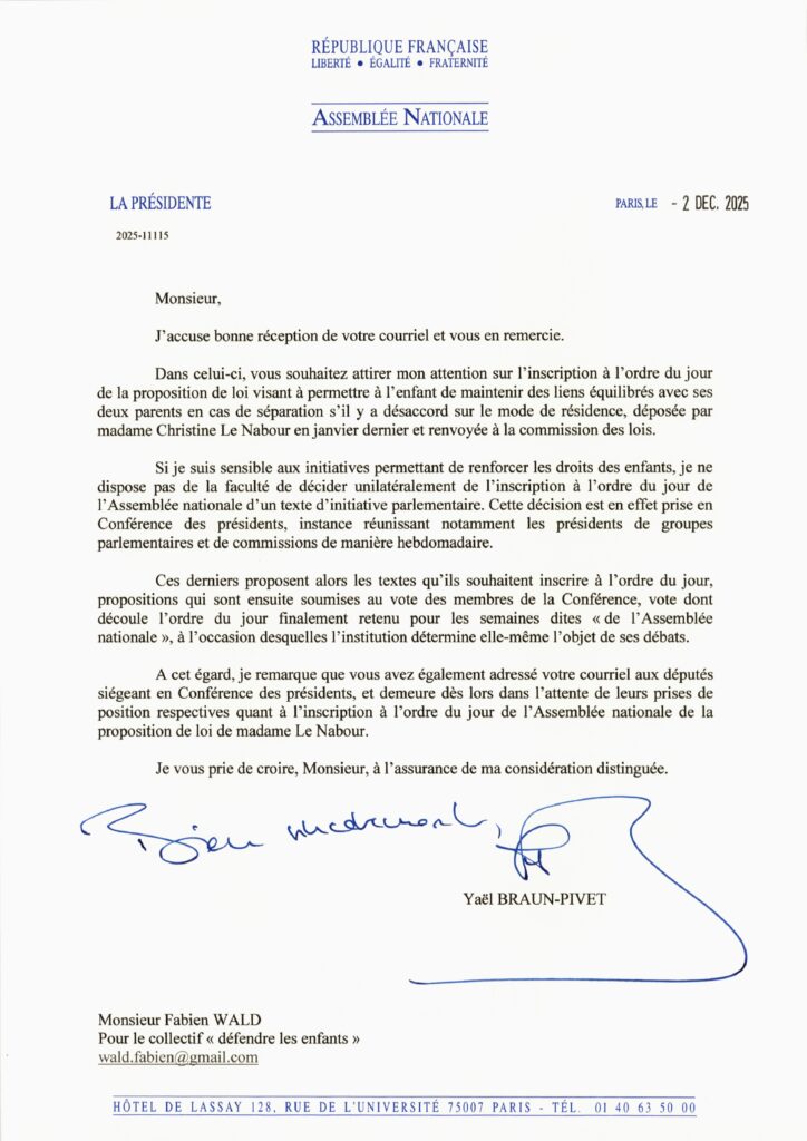 Selon un courrier daté du 2 décembre 2025 de la présidente de l’Assemblée, Yaël Braun‑Pivet, adressé au collectif Défendre les enfants, le texte est « en attente de programmation » à l’ordre du jour.