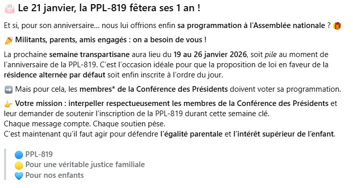 En d’autres termes, si la PPL 819 a été déposée et cosignée par de nombreux députés, sa discussion en séance n’a pas encore été fixée — ce qui explique d’autant plus l’importance de la PPL 2184 : elle traite un volet complémentaire (les prestations sociales) mais sur des bases concrètes, opérables sans redéfinir le régime global de garde.