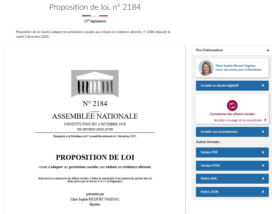 Le Proposition de loi n° 2184 a été déposée à l’Assemblée nationale le mardi 2 décembre 2025, dans le cadre de la 17ᵉ législature. Son intitulé complet : « Proposition de loi visant à adapter les prestations sociales aux enfants en résidence alternée ».
