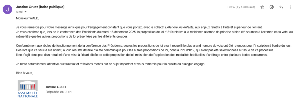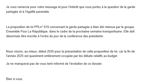 “La proposition de loi PPL n°819 concernant la garde partagée a bien été retenue par le groupe Ensemble Pour La République, dans le cadre de la prochaine semaine transpartisane.
