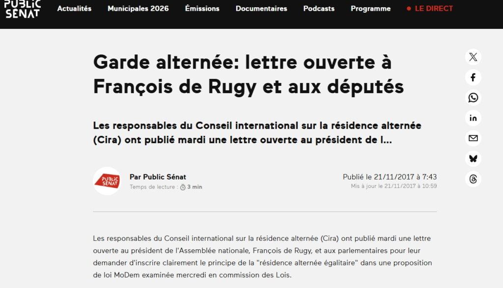 On notera la prise de position du CIRA en 2017 : Garde alternée: lettre ouverte à François de Rugy et aux députés